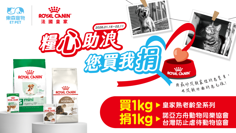 隨著寵物高齡化趨勢,熟老齡貓犬照護需求日益受到關注。寵物健康營養專家法國皇家,今年將二度攜手全台最大寵物連鎖通路東森寵物,啟動「糧心助浪」公益捐糧活動。活動期間 1 月 15 日起至 2 月 11 日,消費者凡於東森寵物門市購買法國皇家熟老齡系列飼料,品牌即「等量捐贈」對應公斤數的飼料予「諾亞方舟動物同樂協會」及「Taiwan SPCA 台灣防止虐待動物協會」。本次預計捐贈 2,300 公斤,以實際行動與精準營養支持老病殘浪浪的生活品質,落實「尊重生命,終養不棄養」的理念。
