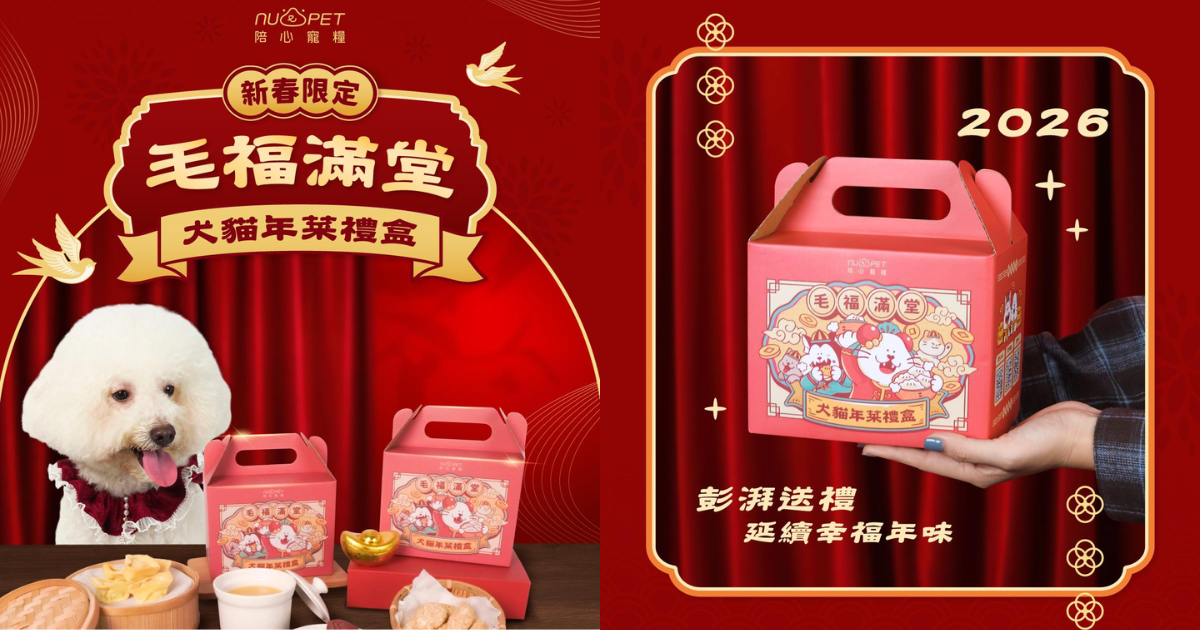 陪心寵糧推出毛孩專屬年菜禮盒,以六道寓意吉祥的年節料理,陪伴毛孩一起吃好、吃飽、迎好年。年菜內容包含祝福滿滿的料理:「金銀財餃」象徵進財滿袋、「鴻運雙獅」氣勢十足、「金雞報喜」寓意紅火開年、「福運金蝦」祝福年年有餘、「團圓蔴荖」帶來甜蜜團聚,「馬運紅龜」則象徵一路順遂、好運相伴。整體菜色以雞肉、牛肉與魚肉為主軸,狗狗與貓貓都能安心享用。年菜禮盒主打開封即食的便利設計,即使在忙碌的新年期間,也能輕鬆準備毛孩的一桌好菜。此外,凡於 1 月底前下單,即可享新春特惠8折,並加贈紅包與春聯組,為毛孩與家庭增添更多過年喜氣。